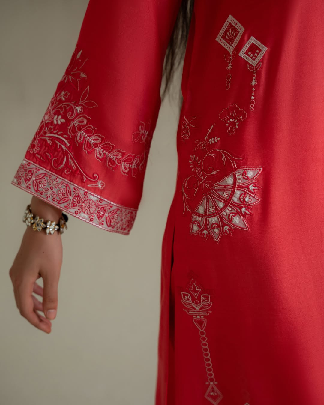 ‘The Nova Coral three-piece ensemble features floral and geometric embroidered motifs in complementary hues. Pair the cotton silk set with our chiffon dupatta for an elevated look for any time of the day.